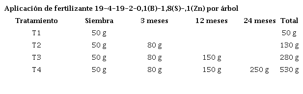 En plantaciones en México se han realizado aplicaciones de cal agrícola a la siembra y una fertilización de 50 g árb-1 de N-P-K con la fórmula 17-34-30 a los 30 días de plantado y se obtuvo incrementos medios anuales de 6.7 cm año-1 en diámetro y de 4.08 m año-1 en altura (Pérez, 2009). En plantaciones en la Amazonia se ha registrado que el tiempo de respuesta para la G. arborea es de 254 días al aplicar fertilización mineral hasta los 24 meses (Mora y Valarezo, 2018; Valarezo et al., 2017). Estos y otros estudios en G. arborea se han enfocado en la determinación de la dosis adecuada y de la mejor combinación de enmiendas; sin embargo, no consideran la continuidad de la fertilización a largo plazo y su posible efecto en el rendimiento.