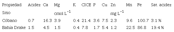 Entre ambos sitios existen diferencias en términos de fertilidad natural, principalmente en los contenidos de calcio, magnesio, la capacidad de intercambio catiónico efectiva (CICE), la saturación de acidez y otras propiedades fisicoquímicas que son fundamentales para el desarrollo óptimo de plantaciones de melina. De acuerdo con los resultados obtenidos, el suelo en Bahía Drake presenta menor fertilidad, en comparación con el suelo de Cóbano. En efecto, Bahía Drake presenta un 61 % menos de CICE, un 16 % más de saturación de acidez y una diferencia en el contenido de calcio de 11.8 cmol (+) L-1 (Cuadro 2).