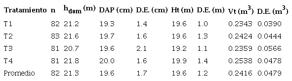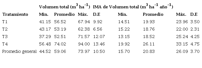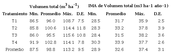 El promedio del volumen total por hectárea fue de 98.8 y 59.1 m3 ha-1 en los sitios de Cóbano y Bahía Drake respectivamente, siendo Cóbano el sitio con mayor productividad por área. En ambos sitios el mayor volumen promedio se registró en el tratamiento de fertilización continua hasta los 24 meses (T4). Este tratamiento alcanzó un IMA máximo de 37.7 m3 ha-1 año-1 en el caso de Cóbano (Cuadro 5) y 33.15 m3 ha-1 año-1 para Bahía Drake (Cuadro 6).