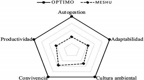 Los resultados se agruparon de acuerdo con los indicadores seleccionados y dentro de los atributos correspondientes, con base en las dimensiones económica, social y ambiental. La escala de valorización utilizada fue la de Fonseca y Fonseca (2014) que propone rangos del 1 al 5 donde: el 1 no sostenible, 2 escasamente sostenible, 3 medianamente sostenible, 4 moderadamente sostenible y 5 sostenible. Finalmente, los resultados en las mediciones de los indicadores se presentaron de manera integral en un gráfico tipo radar (Figura 1), ya que este permite visualizar a través de ejes separados los puntos críticos del sistema.