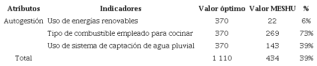 La autogestión es el punto crítico del sistema, está compuesto por tres indicadores que miden el uso de tecnologías que atenúan los impactos negativos relacionados con ellas. El indicador de uso de energías renovables ha ponderado la calificación más baja del estudio, a raíz de la ausencia de energías alternas en los hogares, así como la escasa información con la que cuentan las familias sobre estas ecotecnologías. Respecto al indicador uso de sistema de captación de agua pluvial, si bien los hogares no cuentan con un sistema como tal que les permita captar, tratar y almacenar agua, tienen la costumbre de recoger un poco de agua, como se mencionara en el atributo adaptabilidad. Finalmente, el indicador acerca del tipo de combustible empleado para cocinar obtuvo un resultado alto, dado que las familias emplean mínimamente combustibles que dañan al ambiente, como leña o carbón (Cuadro 1).