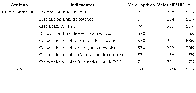 La cultura ambiental representa el segundo mejor desempeño, puesto que el comportamiento de la población respecto a los residuos sólidos urbanos (RSU), plantas de traspatio y energías renovables es bueno. El indicador de disposición final de los RSU mostró una ponderación alta, los hogares disponen de sus residuos en tiempo y forma permitiendo la recolección eficiente por parte del servicio de recolección. A pesar de lo anterior, existen indicadores negativos como los de residuos de manejo especial (baterías y electrodomésticos), debido a que suelen desecharse junto con los demás; esta práctica no es sostenible y deber ser atendida para que no continue impactando negativamente el ambiente (Cuadro 2).