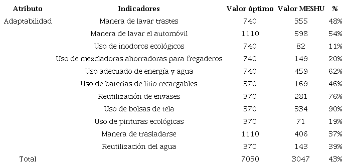 La adaptabilidad obtuvo un valor del 43 % debido a que la comunidad presenta diferentes comportamientos que son favorables para el ambiente. Los indicadores acerca del uso de bolsas de tela, uso adecuado del agua y energía, así como el de reutilización de envases muestran que la población busca un ahorro en el gasto familiar, ya que emplean estrategias como: utilizar bolsas de tela para realizar sus compras, captan en envases o contenedores el agua pluvial para limpiar el patio y lavar el coche, de la misma manera ocurre con otros envases, ya que las familias aseveran darles un segundo uso, por ejemplo: los envases de refresco los utilizan como recipiente para hacer hielo y los envases de detergentes los transforman en macetas o inclusive para almacenar agua pluvial (Cuadro 3).