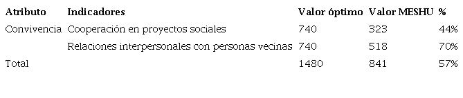 El atributo convivencia evalúa el nivel en el que integrantes del hogar se relacionan con las personas de su comunidad. La convivencia refiere a la necesidad de que las personas integradoras de una comunidad se interrelacionan para generar una sociedad que satisfaga sus diferentes aspiraciones. La sostenibilidad requiere que quienes habitan una comunidad participen activamente en el diagnóstico y priorización de los problemas, con el objetivo de tener preparación para afrontar situaciones de riesgo asociados a los constantes cambios en el ambiente (Folke et al., 2005; Rueda-Rodríguez, 2022).