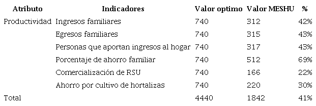 El valor de ponderación de productividad fue menor al 50 %, el indicador con porcentaje más bajo corresponde a la comercialización de RSU generados en el hogar, esto se debe a que solo un pequeño porcentaje de la población respondió ser capaz de producir ingresos monetarios por la venta de residuos comercializables como: cartón, papel, plástico o aluminio. Lo mismo ocurre con el indicador de ahorro por cultivo de hortalizas, el tiempo y esfuerzo que se necesita para realizar ambas actividades y la baja remuneración económica induce no realizar estas acciones. Al contrario, los indicadores de ingresos y egresos familiares, así como el de ahorro, obtuvieron mejores porcentajes. Sin embargo, los porcentajes obtenidos indican que casi el 60 % de los hogares encuestados obtienen ingresos inferiores a $ 16 000 pesos mensuales (Cuadro 5).