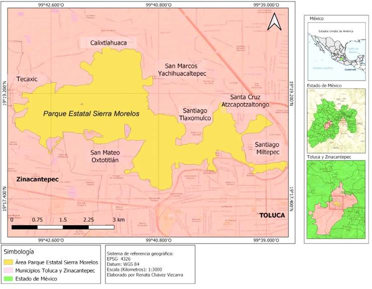 El estudio tuvo lugar en el PESM (Figura 1), una zona delimitada administrativamente en el municipio de Toluca, Estado de México, que alberga ecosistemas forestales, lacustres y agrícolas. Posee una superficie total de 1 255 ha de terrenos montañosos, de los cuales: 270.33 ha son zonas de aprovechamiento sostenible, 628.39 ha de preservación y 50 ha de uso público (Viscaíno, 2018). Se caracteriza por ser el área natural más grande dentro del municipio, considerada como la isla verde. Entre sus características sobresale su belleza escénico-paisajística y por su importancia ecosistémica ofrece servicios ambientales en recarga de acuíferos; además, es hábitat de especies endémicas y migratorias (Gutiérrez, 2007). El parque tiene potencial para brindar experiencias y adquirir aprendizajes sobre el cuidado de los ecosistemas vivos, así como desarrollar valores ambientales en los visitantes.
