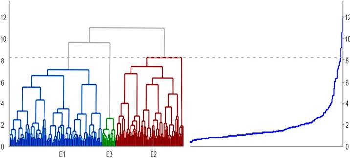 Los factores obtenidos permitieron realizar un análisis jerárquico de conglomerados (AC). Con el fin de establecer el número de conglomerados más representativo, a partir del método de Ward y las medias k, para identificar el punto de corte que mostraba mayor separación entre grupos, se utilizó el dendrograma y el gráfico de distancia euclídea, siguiendo la metodología de Martínez-García et al., 2015. Esto dio como resultado la formación de grupos basados por estadios, determinados por su homogeneidad entre las variables representativas de cada clúster formado. Una vez agrupados los sujetos en grupos, para comprobar la diferencia entre ellos, la prueba no paramétrica de Kruskal-Wallis fue aplicada. A partir de la medida central de dispersión las medianas y el rango intercuartílico fueron obtenidas.