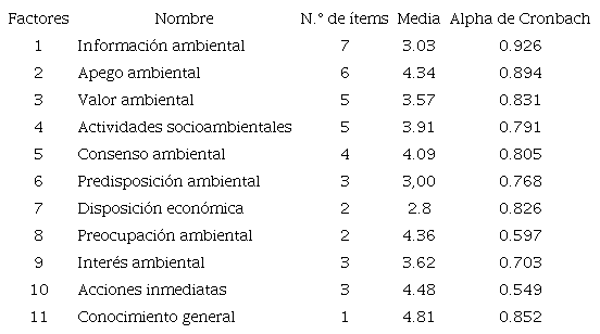 Al aplicar el método de extracción de componentes principales fueron eliminados 14 ítems, que no cumplieron con un valor superior a 0.5 en la matriz de comunalidad, obteniendo un diseño final de 38 variables: 11 factores fueron identificados, que explican el 70.88 % de la varianza acumulada con un coeficiente Kaiser-MeyerOlkin de 0.792 y la prueba de esfericidad de Bartlett (p <0.001), lo que confirma una fiabilidad de las escalas empleadas. El Cuadro 1 indica los factores y las cargas interpretadas, en función de las variables asociadas a las dimensiones de la conciencia ambiental.