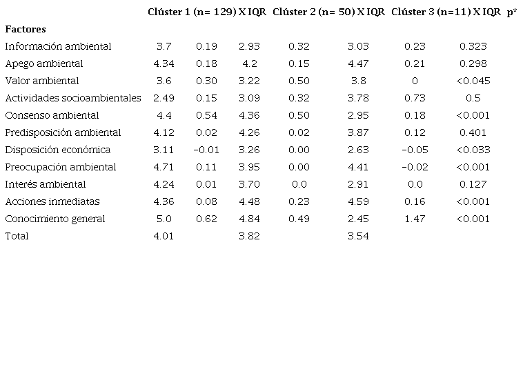 (Resultados): Fueron 11 factores identificados, explicando el 70.88 % de la varianza acumulada. El análisis de conglomerados identificó tres grupos; Estadio 1: discursivo-intencional pasivo; Estadio 2: predisposición ambiental y; Estadio 3: afectivo de acciones convenidas.