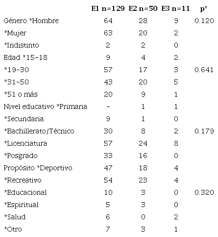 En cuanto a la distribución por género, los 3 grupos no muestran diferencias, aunque los hombres representan la mayoría. En la variable edad, sobresale que el E1 concentra más jóvenes adultos y el E2 tiene el mayor número de adultos.