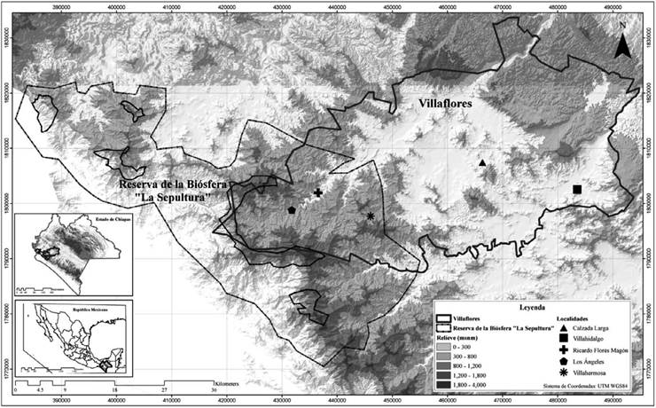 El estudio se realizó en el municipio de Villaflores del estado de Chiapas, en el sureste de México (16º 10’ 02.76” y 16º 35’ 07.50” de latitud norte, y 93º 02’ 47.68” y 93º 46’ 17.61” de longitud oeste) (Figura 1). La parte baja del municipio, conocida como microrregión Valles, se ubica en la Depresión o Valles Centrales de Chiapas, y es una zona caracterizada por un relieve plano y ondulado con laderas tendidas. Su vegetación natural está compuesta por selva baja caducifolia, mediana subcaducifolia y subperennifolia, así como áreas de sabana. Domina un clima Aw2(w) cálido subhúmedo con lluvias en verano. La parte alta, microrregión Sierra, forma parte de la Sierra Madre de Chiapas, donde domina un relieve montañoso con laderas abruptas, y donde la vegetación natural son bosques templados de pino-encino, encino y neblina; el clima en esta área puede ser A(C)m(w) semicálido húmedo, A(C)w2(w) semicálido subhúmedo y C(m)(w) templado húmedo; todos con lluvias torrenciales en verano (Instituto Nacional de Estadística y Geografía (INEGI), 2023). Además de la delimitación biofísica que divide y diferencia ambas microrregiones, la microrregión Sierra se diferencia de los Valles en que se encuentra dentro de la zona de amortiguamiento de la Reserva de la Biosfera “La Sepultura” (REBISE) (Figura 1).