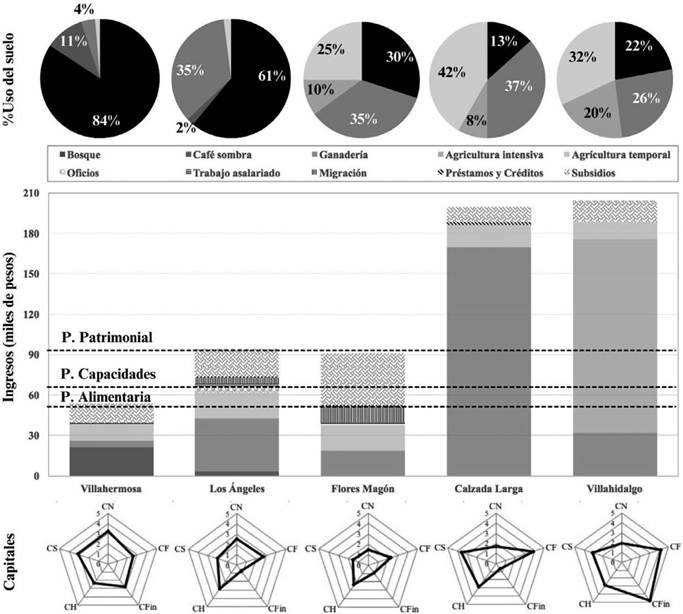 En las comunidades de los Valles, sus capitales son muy similares en ambas unidades de análisis; la diferencia radica en que Calzada Larga optó por un modelo extensivo, basado en la ganadería de baja inversión, con uso del fuego y bajo uso de fuerza de trabajo; y Villahidalgo en un modelo intensivo, basado los monocultivos con alto uso de insumos agrícolas y de mano de obra (Figuras 2 y 4). La distribución de capitales se debe al proceso histórico de fundación de las comunidades, que les permitió a los Valles poseer las mejores tierras para la producción; además, como producto del modelo de desarrollo “Sustitución de importaciones”, donde el Gobierno les dotó de infraestructura productiva (agroquímicos, maquinaria, hatos ganaderos) e infraestructura básica (caminos, servicios básicos, escuelas, servicios de salud) (capital físico), que les permite tener mayor acceso al mercado y a capacitación (capital humano); también son comunidades más organizadas y hay presencia de organizaciones productivas consolidadas (capital social). Sin embargo, cuando se analizan las comunidades de los Valles aparecen otras problemáticas, por ejemplo, con base en los ingresos netos, las familias de los Valles también son pobres y su capital natural está deteriorado o en proceso de deterioro (Figura 4).