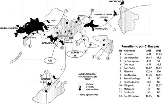 Con el material recuperado de esas localidades se estudió su eficacia en todas las especies de taladradores, lo cual reveló el uso potencial de la avispa como regulador de todas ellas, incluida D. centrella, que no era parasitada efectivamente por L. minense(Linares y Ferrer, 1990). Mediante datos obtenidos del monitoreo realizado por el personal del Central Río Turbio, se observó un parasitismo cercano al 50 % a más de 20 km del laboratorio (haciendas Pueblo Nuevo, municipio Simón Planas, estado Lara), y Casilda IV (municipio Peña, estado Yaracuy) (Figura 1).