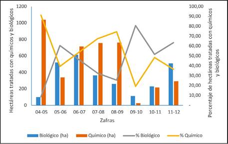 Los resultados en la Azucarera Río Turbio han sido muy positivos (Figura 2), con un mayor control ejercido por el uso de M. anisopliae, en comparación con los insecticidas, entre los años 2004-2012 en áreas afectadas de 140 a 1 331 ha (González, 2012). En la zafra 2004-2005, que comprendía 1 139 ha, se observó que el tratamiento con químicos era del 91 % y el de biológicos 9.8 %. En cambio, en la zafra 2011-2012, para 8 043 ha se observó 63 % para los biológicos y 36 % para los químicos, lo cual demostró el progreso de su utilización. Actualmente hay varias compañías que producen M. anisopliae con varios nombres comerciales, con los cuales se ha logrado una cobertura de 40 000 ha.