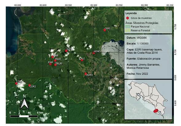 Se seleccionaron 11 sitios con remanentes de bosque maduro. De estos, 9 corresponden a fincas privadas bajo pago por servicios ambientales en la Reserva Forestal Golfo Dulce y 2 sitios dentro del Parque Nacional Corcovado (Cuadro 1; Figura 1).