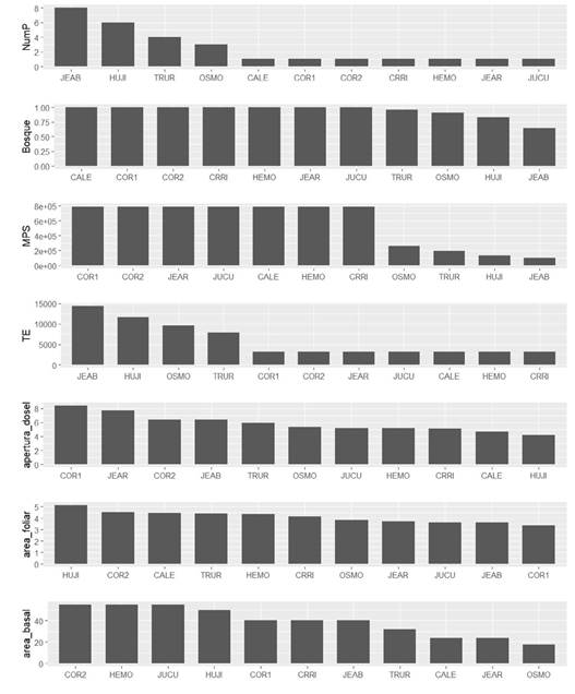 Los sitios JEAB, HUJI, TRUR y OSMO presentaron fragmentación, siendo el primero el más fragmentado, con 8 parches. Por su parte, los demás sitios (CALE, COR1, COR2, CRRI, HEMO, JEAR y JUCU) estuvieron integrados por un solo parche boscoso. Esto se reflejó también en las métricas de tamaño promedio de parche (MPS) y el borde total (TE; Figura 2). Las variables de estructura vegetal, a su vez, mostraron una tendencia menos marcada. COR1 y JEAR presentaron la mayor apertura de dosel, mientras que JUCU, la menor. HUJI presentó una mayor área foliar y COR1, la menor. Finalmente, COR2, HEMO y JUCU obtuvieron la mayor área basal y TRUR, CALE, JEAR y OSMO, la menor (Figura 2).