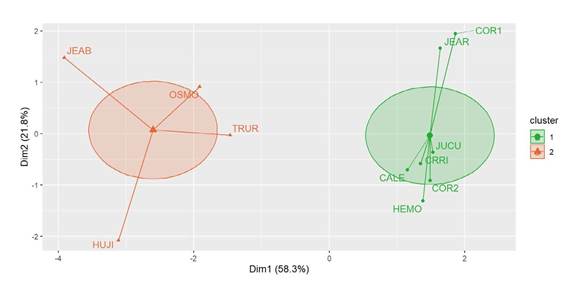 El análisis de conglomerados agrupa los sitios JEAB, OSMO, TRUR y HUJI en el cluster2, y a los demás en el cluster1 (Figura 3).