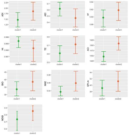 En el caso del índice de complejidad acústica (ACI), el cluster2 presentó valores significativamente mayores al cluster1 (Figura 4), en especial durante las horas de la mañana (5:00-8:00). Por su parte, de manera general el cluster2 mostró una tendencia a valores mayores de diversidad y entropía acústica (ADI, AEI, Hf, TE), con excepción de la entropía temporal que fue mayor en el cluster1.