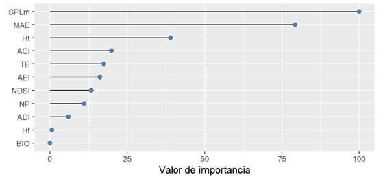 El modelo de clasificación Random Forest clasificó ambos conglomerados de acuerdo con los valores de los índices acústicos con un 93.7 % de precisión. Los índices con mayor valor de importancia en la clasificación fueron SPLm y MAE (Figura 5).