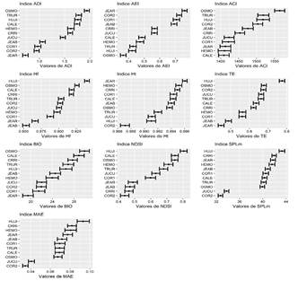 Los índices acústicos variaron de acuerdo con el sitio evaluado. No obstante, cada uno presentó una tendencia diferente en su variación con respecto a los sitios (Figura 6).