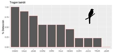 Se registró un total de 1 909 vocalizaciones para Trogon bairdii y 423 para Hylopezus perspicillatus. La especie T. bairdii se detectó en todos los sitios con excepción de JEAR, la probabilidad de detección diaria de esta especie fue de 0.5 o mayor en la mayoría de los sitios (6 de 11) y en el caso del sitio OSMO fue detectado durante todos los días evaluados (Figura 7).