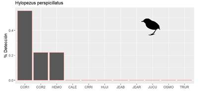 La detección de Hylopezus perspicillatus fue más baja que la de T. bairdii. Esta especie se encontró únicamente en 3 de los 11 sitios. El lugar con mayor cantidad de detecciones fue COR1, con un total de 417 detecciones y una probabilidad de detección diaria de 0.55. Los otros sitios donde se encontró fueron COR2 (7 registros) y HEMO (2 registros), para una probabilidad de detección diaria de 0.22 en ambos (Figura 8).