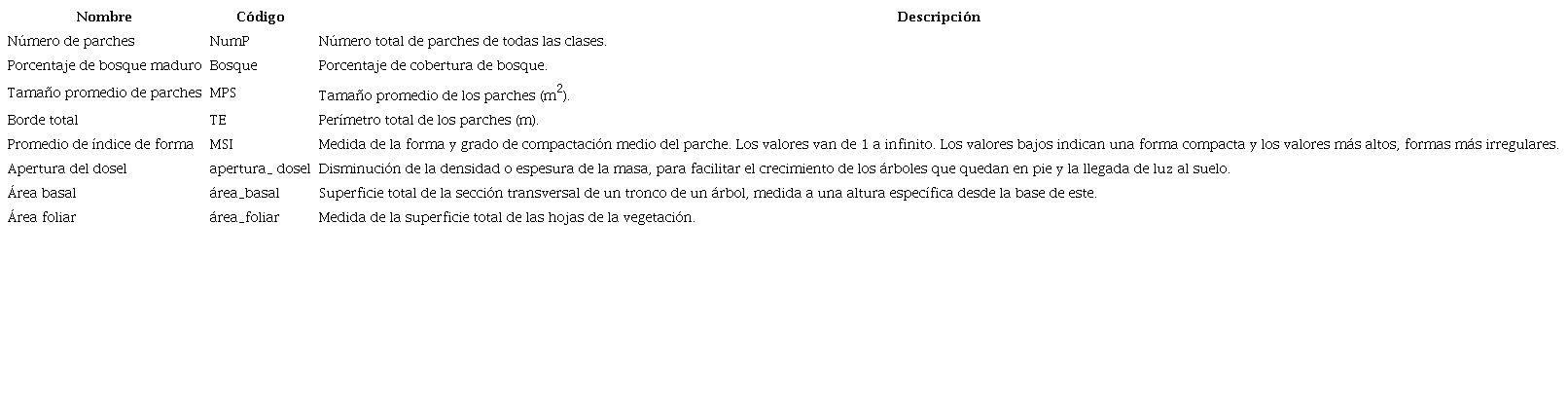 Se delimitó un búfer de 500 m alrededor de la ubicación de cada grabadora y se calculó una serie de métricas de paisaje, utilizando como base el mapa de cobertura y uso del suelo del Atlas de Costa Rica 2014 (Cuadro 2). Estas variables fueron seleccionadas de acuerdo con su posible efecto sobre la biodiversidad, reportado en la literatura (Fahrig, 2003), y como una manera de caracterizar cada sitio de muestreo en función de su matriz circundante. El análisis se realizó en ArcGIS (ESRI, 2016) con la extensión Patch Analyst (Rempel et al., 2012).
