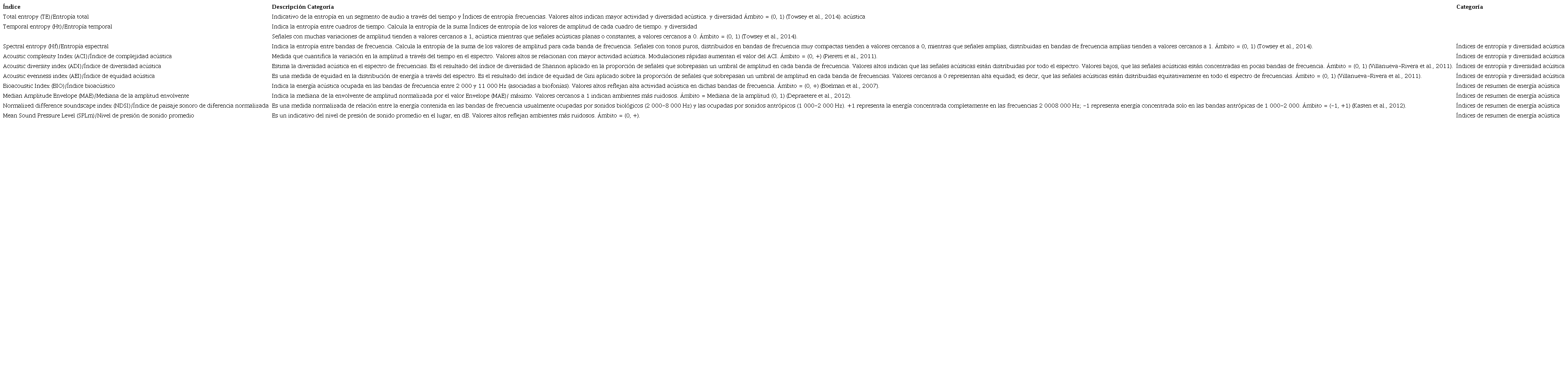 Los índices TE, Ht, Hf, MAE y NDSI fueron calculados con base en las funciones descritas en el paquete seewave (Sueur et al., 2008). Los índices ADI, AEI, BIO y ACI se calcularon de acuerdo con las funciones del paquete soundecology (Villanueva-Rivera y Pijanowski, 2018), al modificar el ámbito de frecuencias empleado de 2 000 a 11 000 Hz, pues es más adecuado para cubrir la diversidad de sonidos en zonas tropicales (Pieretti, com. pers; Cuadro 3).