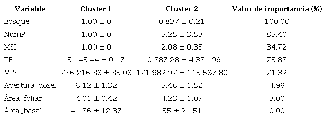 El cluster1 se caracterizó por contener sitios con una mayor proporción de bosque, mayor tamaño promedio de parches, menor número de parches, menor borde y menor índice de forma de parche. A su vez, el cluster2 se identificó por una menor proporción de bosque, menor tamaño de parches promedio y mayor índice de forma, número de parches y borde total (Cuadro 4). Las variables más importantes en la clasificación de los clústeres son el porcentaje de bosque y el número de parches (Cuadro 4).