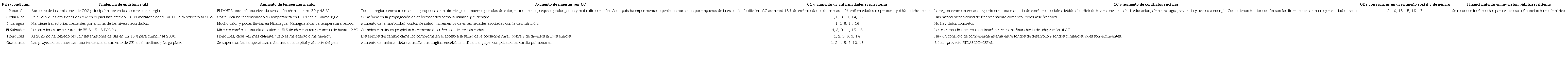 Para responder al objetivo y los alcances de esta investigación, en el Cuadro 1 se presenta un resumen de indicadores sobre los principales retos y desafíos regionales para enfrentar los efectos de la era de ebulición. En complemento, para cada país, se exponen algunos condicionantes que siguen limitando las acciones para la adaptación y resiliencia climática efectiva. Se da inicio con una progresión desde el norte hacia el sur de la región, a pesar de las declaratorias de la Ley Marco de Cambio Climático, el Plan de Desarrollo Katún Nuestra Guatemala 2032, el Acuerdo de París, la Contribución Nacionalmente Determinada, y el Plan de Acción Nacional de Cambio Climático, Guatemala no ha logrado revertir las tendencias de aumento de emisiones contaminantes emitidas por la pérdida de cobertura boscosa (deforestación, 26 %), transporte y energía (27 %) y agricultura y ganadería (23 %) (Ministerio de Ambiente y Recursos Naturales de Guatemala (MARN), 2021a).