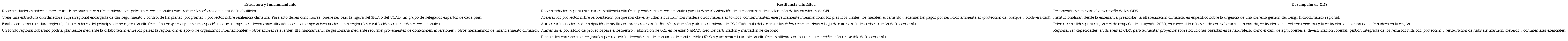 En complemento al análisis de retos de cada país, en el Cuadro 2 se enumera un conjunto de oportunidades para la región, con el fin de enfrentar los embates de esta nueva era de ebullición climática. Además, se han identificado desafíos (Cuadro 1) y oportunidades (Cuadro 2) para estimular la gobernanza regional resiliente. Estos, aunque balances opuestos, son principios de realidad complementarios para estructurar una hoja de ruta regional climáticamente eficiente, tecnológicamente innovadora y socialmente inclusiva.