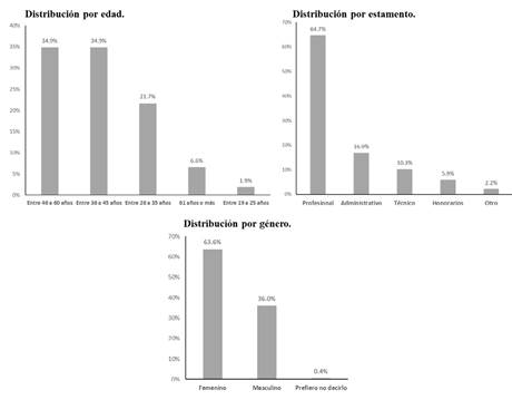 Como se observa en la Figura 1, las personas encuestadas, predominantemente, pertenecían al sexo femenino, con un 63.6 % de representación; siguió el sexo masculino, con un 36.0 % y hubo un 0.37 % que no se pronunció. Esta cifra es consistente con la composición de la estructura de la dotación del Gobierno central chileno (Dirección de Presupuestos (DIPRES), 2024). Con respecto al rango etario, se puede observar que la mayor parte de las personas funcionarias públicas participantes tenían entre 36 y 60 años, lo que representa un 69.8 % de la muestra, seguido por el rango etario entre los 26 y 35 años, que equivale a un 21.7 %. Por el otro lado, el estamento mayoritario provenía del grupo de profesionales.