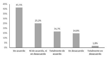 En la misma línea, se preguntó por las campañas educacionales y su impacto respecto a los componentes como el cuidado del agua, la eficiencia energética, el reciclaje, la disminución en el consumo de papel, entre otros. En la Figura 3, se muestran que la suma de quienes optaron por las alternativas “totalmente de acuerdo” y “de acuerdo” representarían un 58.2 %, una tendencia positiva respecto a este tópico. No obstante, al igual que el resultado anterior, se presenta un desafío para las instituciones y el PEV, en el sentido de alcanzar mayores coberturas.