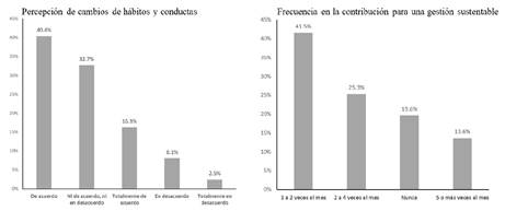 Como se observa, hay una tendencia positiva de los cambios (54.7 %) entre quienes estaban “totalmente de acuerdo” y “de acuerdo”, lo que se refuerza con la percepción de que existe una frecuencia en la contribución total de un 80.4 %, el cual va desde una acción hasta 5 o más acciones al mes.