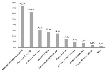 Por último, se presentan en la Figura 6 las principales acciones proambientales, que se desarrollan al interior de las instituciones, identificadas por las personas encuestadas.