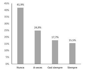 Es oportuno señalar que la cantidad de personas capacitadas por institución se realiza de mutuo acuerdo con el MMA, como agente encargado del PEV. Por lo tanto, el grado de compromiso que tenga la institución en esta materia puede influir en que el desarrollo de una cultura ambiental sea mucho más lento de lo esperado; por ejemplo, se presentó la paradoja de que, frente a la pregunta de la encuesta ¿Ud. ha participado en capacitaciones o charlas vinculadas con el medio ambiente en el marco del programa Estado Verde?, un 41.9 % afirmó que “nunca” y un 15.1 % indicó que “siempre”, tal como se muestra en la Figura 7: