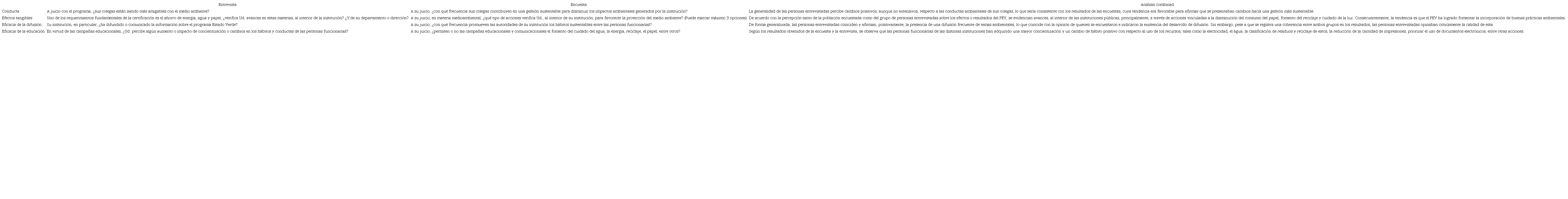 Entrevistas: Se aplicó un muestreo teórico de 15 entrevistas semiestructuradas, tomando como criterio de inclusión al personal que tuviera más de 1 año de antigüedad y que perteneciera a las instituciones públicas adscritas en el nivel de acreditación, por cuanto en esa etapa se desarrollan, con mayor profundidad, los procesos de educación y comunicación ambiental. En cuanto al criterio de exclusión, no debía entrevistarse integrantes del Comité de Estado Verde, ya que su posición de cercanía con las personas funcionarias del Ministerio del Medio Ambiente podía restar objetividad en sus opiniones. La cantidad de preguntas fue 9, las cuales estaban divididas en 3 secciones: a) percepción conductual de las personas funcionarias; b) opinión sobre la difusión interna del PEV; c) evaluación del PEV y propuestas de mejoras. El análisis se efectuó mediante el desarrollo de categorías y codificaciones de las respuestas. El periodo de aplicación fue entre del 10 de octubre al 9 de noviembre del 2022, en forma presencial.