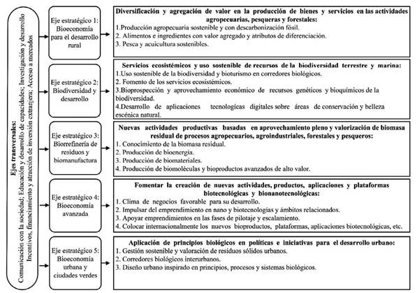 De esta forma, los ejes de la Estrategia se pueden visualizar como rutas que además de ser productivas, ofrecen beneficios de inclusión social y sostenibilidad ambiental. La Estrategia se presenta como una alternativa para repensar la ruta de desarrollo económico del país, en busca de una transición hacia la descarbonización fósil, incorporando entre sus principales elementos la agregación de valor a los procesos productivos por medio de aplicación del conocimiento de principios biológicos y el uso de tecnologías aplicables, entre las cuales sobresale la biotecnología, la cual forma parte principalmente del Eje Estratégico 4: “Bioeconomía Avanzada”, en el cual se centra este artículo4