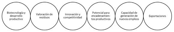 En la Figura 4 se muestra que la biotecnología es un elemento sobresaliente en el eje 4: Bioe conomía Avanzada. Dadas sus características, la biotecnología puede aportar en todos los ejes, en este artículo se relacionará con la valoración de residuos, la innovación y competitividad, el potencial para encadenamientos productivos, generación de nuevos empleos y el incremento de exportaciones, como se presenta en la Figura 5.
