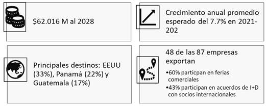 Las características de la biotecnología la hacen ser una actividad con un amplio potencial para la comercialización de productos internacionalmente. A través de la biotecnología se pueden abordar una serie de problemáticas globales (A. Tristán, comunicación personal, 21 de abril de 2023). El sector biotecnológico es uno de los más innovadores en el ámbito mundial y con mayor proyección de crecimiento global, con aplicaciones en múltiples industrias y con un tamaño del mercado bastante amplio. Costa Rica busca ser un centro de apropiación con talento humano capacitado capaz de ofrecer servicios biotecnológicos de calidad al mundo. El país tiene ventajas como laboratorios, centros de formación universitarios con niveles de investigación y de formación de muy buena calidad, un clúster que aglomera empresas del sector (CRBiomed), entre otros. Dentro de los productos biotecnológicos desarrollados se encuentran controladores biológicos de plagas (biocontroladores), biorremediación y compuestos bioactivos (como los alimentos funcionales, industria cosmética), entre otros (E. Ulloa, comunicación personal, 08 de mayo de 2023).