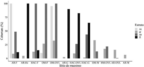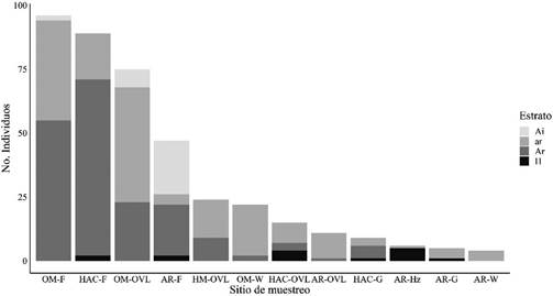 De las coberturas de tipo forestal, AR-F es la única que presenta los 4 estratos (herbáceo, arbustivo, subarbóreo y arbóreo inferior); HAC-F y OM-F registraron 3 estratos. La riqueza más alta (número de especies) y el mayor número de individuos (Figura 1) se encontró en los estratos arbustivo y subarbóreo. Las coberturas OVL se encontraron entre 2 y 3 estratos, la riqueza más alta y el mayor número de individuos se presentó también en los estratos arbustivo y subarbóreo. En las demás coberturas (pastizal - G, herbazal-Hz y humedal-W) domina el estrato arbustivo y herbáceo.
