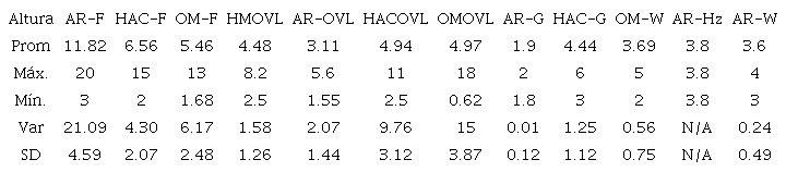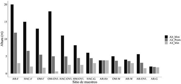El Cuadro 6 y Figura 3 muestran la variación de alturas de dosel de los sitios de muestreo. En las coberturas de tipo forestal (F) y otra vegetación leñosa (OVL) las alturas promedio oscilan entre 5.6 m y 20 m, siendo el sitio AR-F donde se encontraron las mayores alturas. En las coberturas de tipo pastizal, herbazal y humedal, por lo general, se presentaron algunos elementos arbóreos dispersos con alturas bajas (por debajo de 6 m).