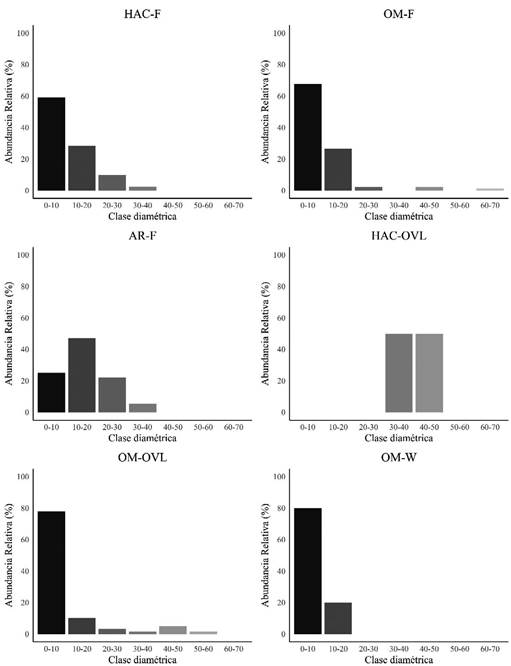 En la mayoría de los sitios se presentan estructuras diamétricas de valores bajos (entre 2.55 cm y 20 cm); únicamente en sitios como AR-F y HAC-OVL presentan una abundancia de especies con clases diamétricas mayor a 20 cm y hasta 49 cm. Los sitios HAC-F y OM-F tienen tendencia de j invertida, que indica la presencia de individuos juveniles y señala que la comunidad está en proceso de desarrollo a etapas de crecimiento más avanzado. De acuerdo con Juárez García & Saragos Méndez (2015), la mayor proporción de juveniles en una zona significa reclutamiento o regeneración natural de las especies.