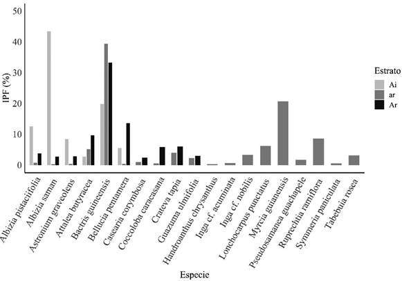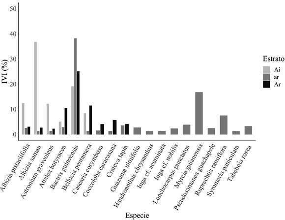 Las especies más representativas son B. guineensis (estrato arbustivo, subarbóreo y arbóreo inferior); Myrcia guianensis y Ruprechtia ramiflora (estrato arbustivo), Bellucia pentamera, Attalea butyracea, Coccoloba caracasana y Crateva tapia (estrato subarbóreo) y en el estrato arbóreo inferior: Albizia saman, Albizia pistaciifolia y Bellucia pentamera (Figura 5 y Figura 6).