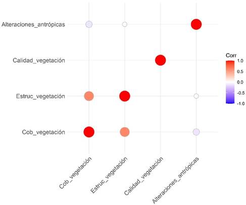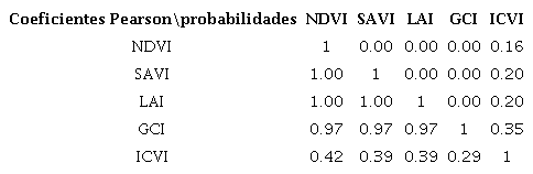También existe una alta correlación entre los índices espectrales calculados y una baja correlación entre estos y el índice ICVI propuesto (Cuadro 8). Estos resultados subrayan la importancia de considerar múltiples índices espectrales y su relación con índices de calidad de la vegetación como el que se propone aquí, para una evaluación más precisa del estado de la vegetación en diferentes áreas. Lo anterior, debido a que los índices espectrales son indicativos de su salud y se podrían complementar con el índice que aquí se propone, para estimar no solo la salud, sino la calidad o naturalidad de las coberturas vegetales evaluadas.