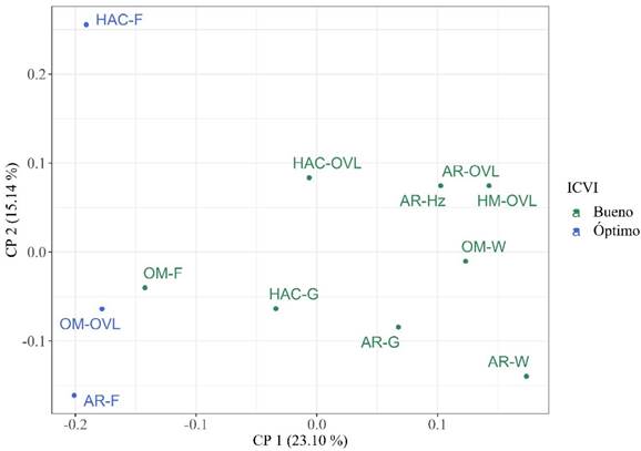 Según el análisis de coordenadas principales (PCoA), realizado con el fin de visualizar la similitud o disimilitud entre los sitios de muestreo debido a los factores contemplados en el índice propuesto, se observa una buena separación entre los factores propuestos en el índice, indicando que cada uno funciona de forma independiente, al haber una baja correlación entre cada uno de ellos (Figura 7). De esta forma, es posible observar una separación entre los sitios con condición buena (verde) y optima (azul) (Figura 8).