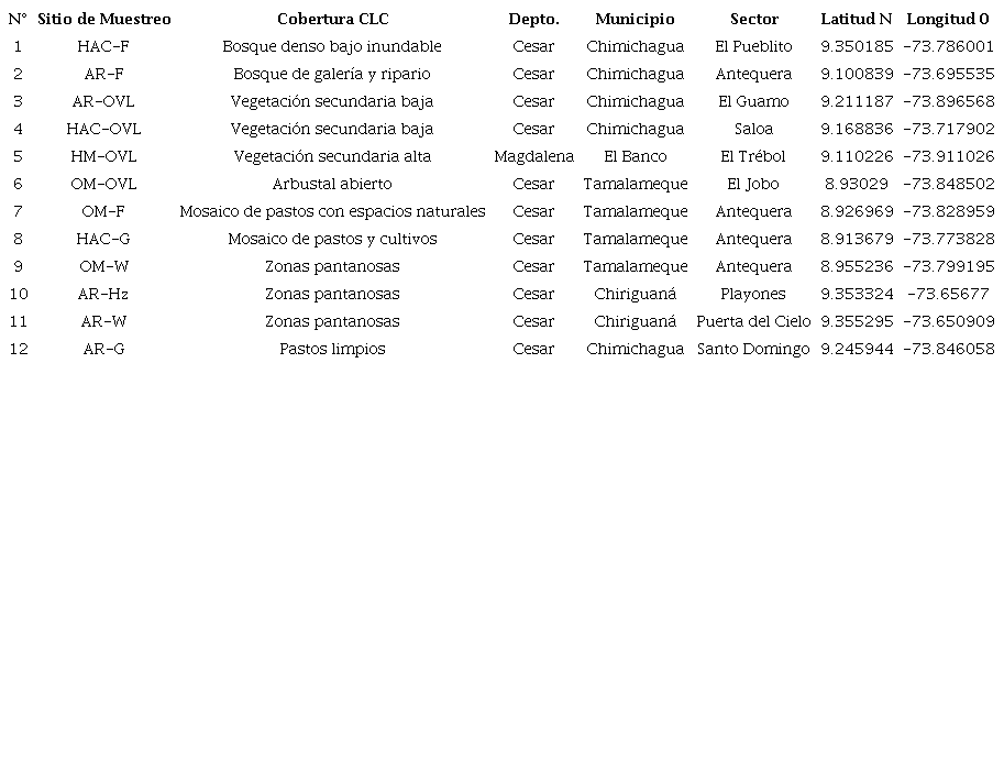 Para la selección de los sitios de muestreo se planteó un diseño muestral estratificado, se partió de la unión de las únicas capas geográficas oficiales disponibles para el área de estudio, que incluyen las unidades cartográficas de suelos (Instituto Geográfico Agustín Codazzi, 2014) y coberturas de la Tierra (Castellanos et al., 2021) a escala 1:100 000 en formato vectorial, que fueron homologadas a clases IPCC (Cuadro 1). Adicionalmente, se tuvieron en cuenta los rasgos propios del ecosistema de humedal, asociados, principalmente, con la disposición de la vegetación desde el espejo de agua hasta la zona inundable, dando prioridad a la zona de transición que, en el complejo cenagoso, se manifiesta en las zonas pantanosas, mosaicos de pastos y cultivos, así como zonas naturales (vegetación secundaria y arbustales).