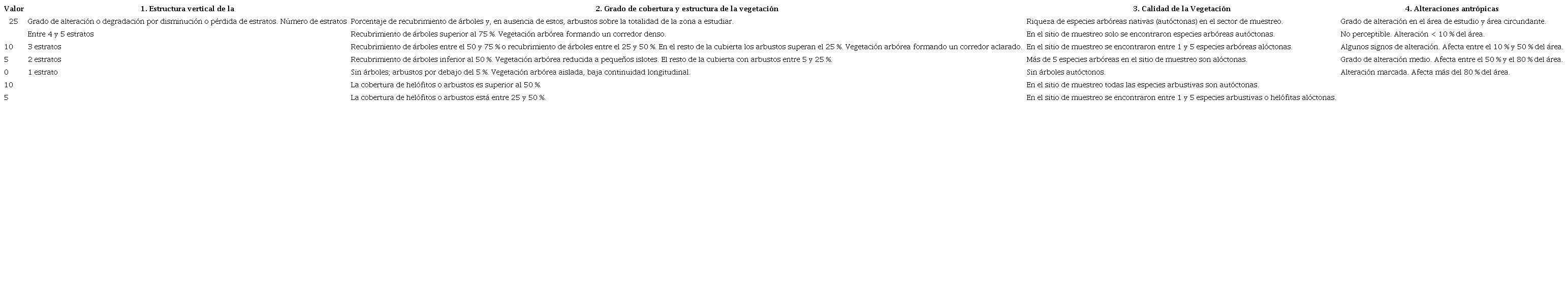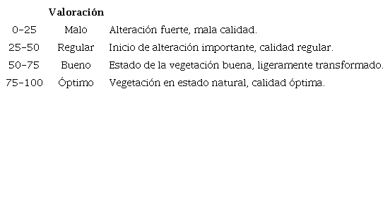 Además, se mantiene la escala de valoración del QBR en donde cada sección se califica de 0 a 25 puntos que, al sumarse, proporciona un valor de 100. Valores de 0-25 indican una vegetación de calidad mala, 25-50 regular, 50-75 buena y 75-100 óptima (Cuadro 3).