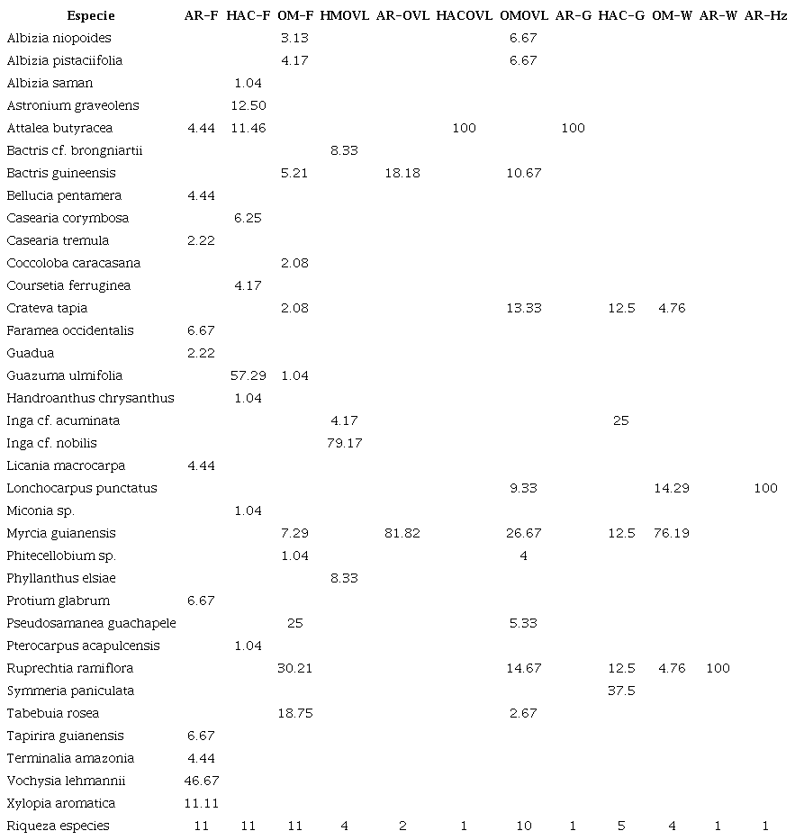 Predominan especies como Myrcia guianensis, Attalea butyracea, Lonchocarpus punctatus y Ruprechtia ramiflora (entre 80 % y 100 %); Vochysia lehmannii, Guazuma ulmifolia, Inga cf. nobilis (entre 30 % y 80 %), especies características de la vegetación inundable del CCZ (Cuadro 4 y Cuadro 5).
