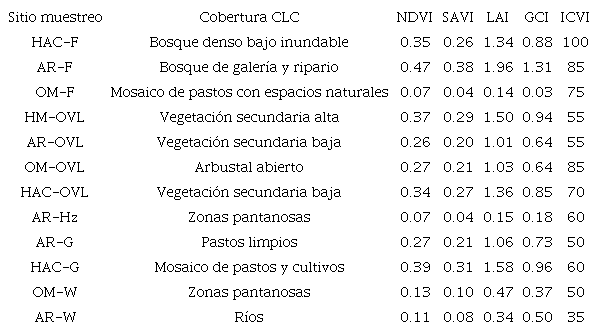 Según los resultados de los índices espectrales, los sitios bosque de galería y ripario (AR-F) y bosque denso bajo inundable (HAC-F) exhiben los valores más altos de los índices evaluados; el NDVI sugiere una vegetación densa, el SAVI indica una vegetación densa y saludable; el LAI una densa cobertura de hojas y, por último, el índice de Clorofila Verde (GCI) una mayor concentración de clorofila. En contraste, se encontraron bajos valores en las zonas pantanosas (AR-G, OM-W, AR-W) (Cuadro 7).